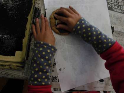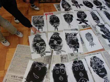 ローラーでインクをつけて,紙はんがを刷りました。すてきな顔がたくさんできました。
