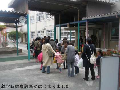 来年度入学する子どもたちの就学時健康診断が実施されました。2時からの受付前に保護者に連れられて子どもたちがやってきました。