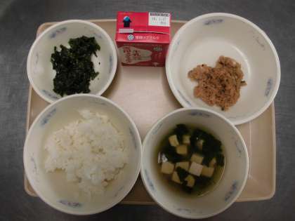今日の給食は,「牛乳」「ほうれん草のごま煮」「ツナそぼろどんぶりの具」「ごはん」「すまし汁」でした。