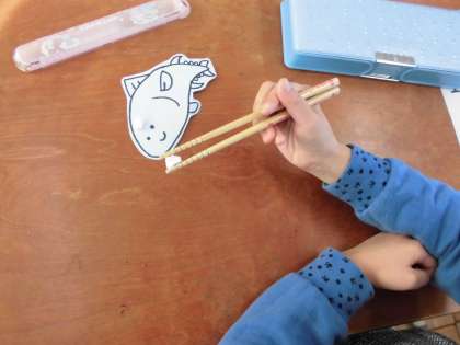 正しい箸の持ち方を教えていただいた後,小さな物をつかんだり,魚をひっくり返す練習をしました。