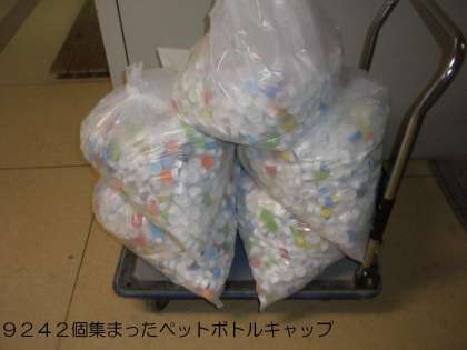 今週末11日(土)に開催されるPTAフェスティバルに持っていく「ペットボトルキャップ」が現時点で9242個集まっています。45リットルのゴミ袋4袋半もあり,持ちきれないほどです。