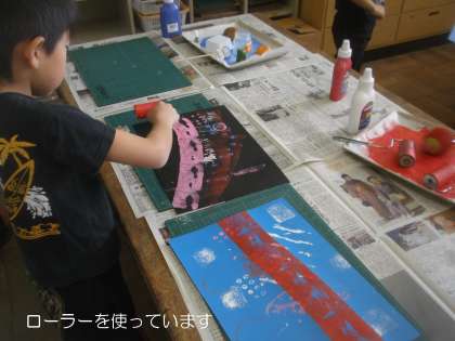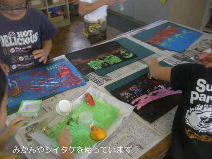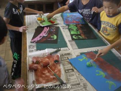 今日は図工で「ペタペタペッタン」(スタンプ版画)をしました。ローラーや手,野菜やくだものを輪切りにしたものを使って,色画用紙にペタペタペッタンとスタンプしていきました。