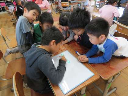 グループ対抗のゲームでもりあがっていました。ゲームの内容は,新しい担任の先生の自己紹介も兼ねていました。元気いっぱいの2年生です。