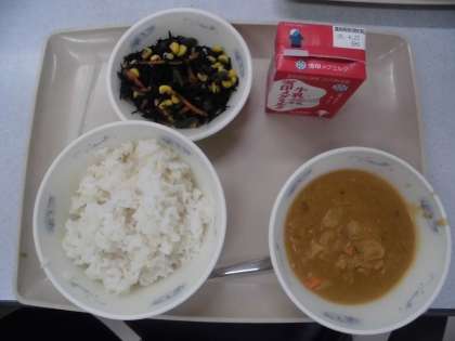 今日の給食の献立は,チキンカレー・むぎごはん・ひじきのソテーでした。