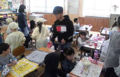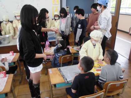 1年生はまだ給食準備に慣れていないので,6年生が優しく教えながら手伝ってくれています。