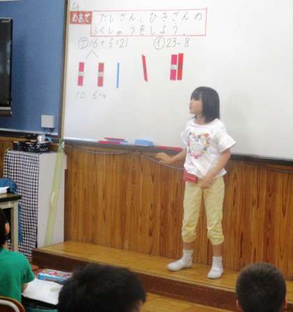 たし算とひき算の復習をしています。数え棒の図を使いながらしっかりと説明しています。