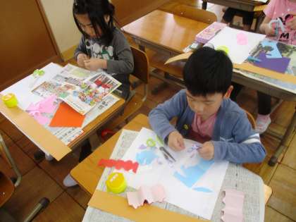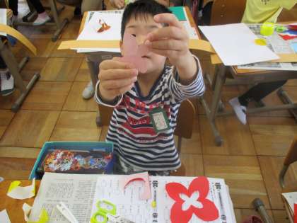 「ちょきちょきかざり」を作りました。折り紙を折ってはさみで切りました。