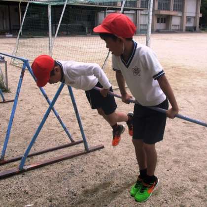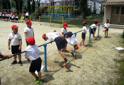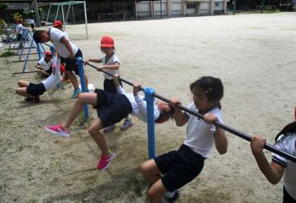 元気いっぱい鉄ぼうの練習をしています。怖くて勇気が出なかった人も,少し補助をすると,「怖くなくなってきた!」と前向きに練習していました。さかあがりの成功までもう少しだった人で,初めて成功できた人もいました。みんなで拍手!