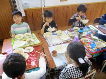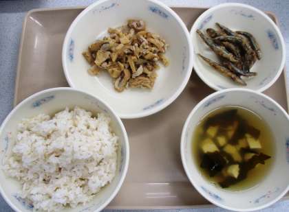今日の献立は,麦ごはん,たけのこご飯の具,きびなごのこはくあげ,すまし汁でした。「お魚おかわりほしい!」と,きびなごのこはくあげは大人気でした。みんなモリモリ食べてどんどん成長してほしいと思います。