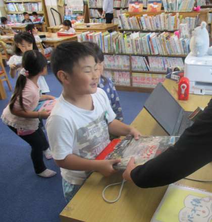 本を返す時に,「1年1組の○○です。本を返します。」としっかり伝えて返却する練習をしています。たくさん本を借りて,どんどん本を読んでほしいと思います。