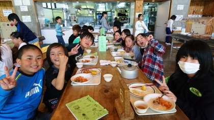 お昼はバイキングです。みんな元気で,おいしそうに食べています。