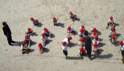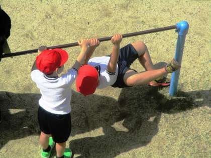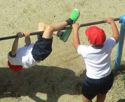 てつぼうの練習をしています。先生や友だちをお手本にいろいろな技に挑戦しています。できる技が増えていくといいですね。