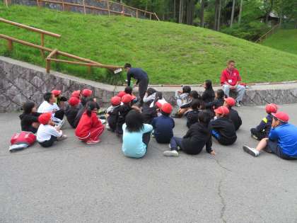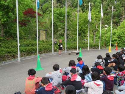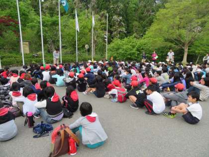 4校合同朝の集いが行われました。代表の子どもが4校役250人の前で堂々と学校紹介をしていました。