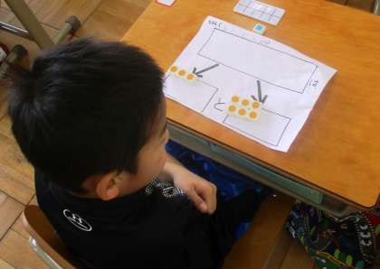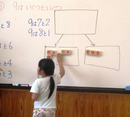 「9はいくつといくつ」になるかを数図ブロックを使って学習しています。前に出てしっかり発表もできています。