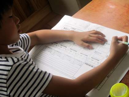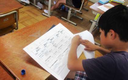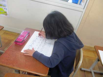 てつぼうの学習カードを書いています。ねらい1では連続技,ねらい2では新しい技に挑戦します。それぞれに目標を立ててがんばります。