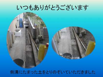 何年もの間にたまった土は,溝の中いっぱいにたまって,雨水等が流れずあふれることがしばしばありました。