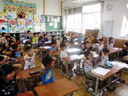 火曜日と木曜日に体幹トレーニング「シャキトレ」を全校で行っています。正しい姿勢で座る体幹を身につけることが,集中力にもつながります。みんなで楽しく取り組んでいます。