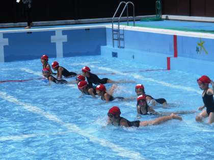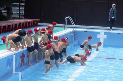 本日より,水遊びが始まりました。今週は,30cm程度の浅いプールで学習をしています。少し肌寒い中ですが,ワニ歩きなど,楽しみながら活動しました。