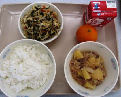 今日の献立は,ごはん,牛乳,肉じゃが(ピリカラみそ味),切り干し大根の煮つけ,みかんでした。肉じゃがは大人気でした。切り干し大根の煮つけもたっぷりありましたが,みんなたくさんおかわりして食べました。ごちそうさまです!