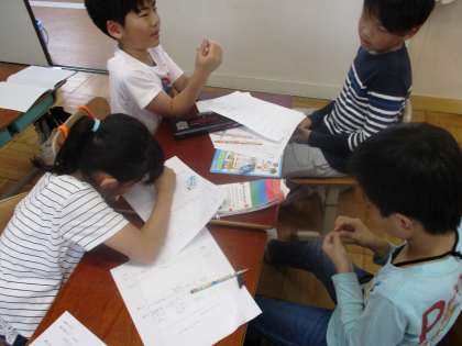 新聞づくりで,取材でインタビューする項目をグループで相談しています。
