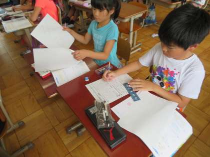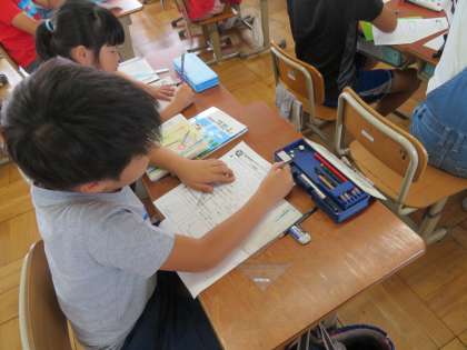 算数科の「垂直・平行と四角形」の学習のたしかめを行っています。「台形とはどんな四角形?」「平行四辺形は?」など学習したことをしっかりとふりかえり問題に挑戦しました。