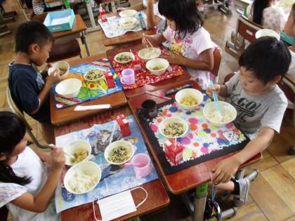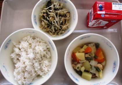今日の献立は,麦ごはん,牛乳,鶏肉と野菜の煮つけ,切り干し大根の煮つけでした。切り干し大根は,出汁がしっかりしみており,噛むとじわっと口に広がり,おいしくいただきました。やわらかい食べ物ばかり食べていると,噛む力が弱まります。かみごたえのある食べ物をしっかり食べて,かむ力をつけましょう。