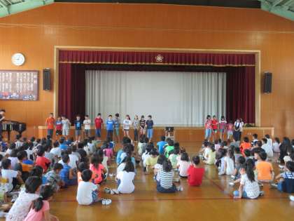 最後に夏休みに全日本ジュニア綱引選手権大会に出場する6年生に全校でエールを送りました。夏休みの間にも練習を重ねていく予定です。本番では,力を出し切ってほしいと思います。