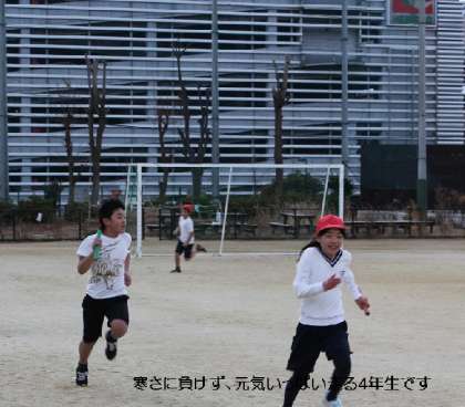 運動場では、4年生が力いっぱいリレーをしています。