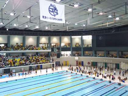 京都アクアリーナで水泳記録会が行われました。本校から6年生6名が参加しました。50mプールで泳ぐのは初めてで,みんな緊張しながら,自分の順番をいまかいまかと応援しながら待っていました!