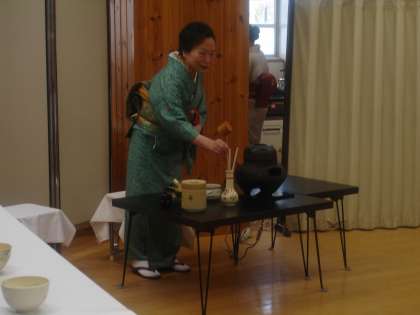 お茶の点て方やお茶やお菓子のいただき方・簡単な作法など,茶道の基本的な内容を教えていただきました。また,お茶碗やお棗(なつめ)・茶さじなどの茶器についてもお話していただきました。