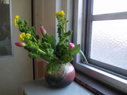 今日は『だしのうま味を生かして,旬の野菜をおいしく食べよう』という内容の授業ですので,家庭科室に今の季節のあった花も準備してくださっています。
