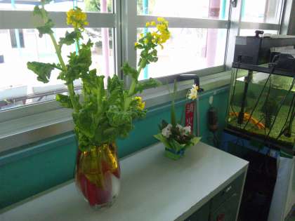 また,職員室の前の棚には,春の花の菜の花を飾っています。子どもたちは,春の気分を味わってくれるかな・・・?