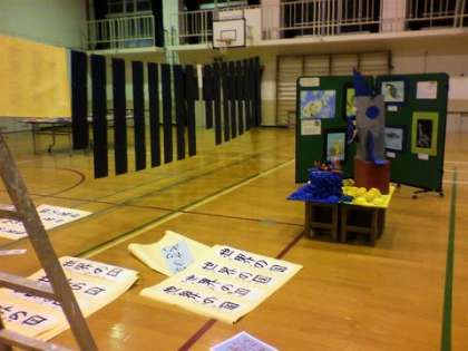 版画や習字、工作や陶器などいろいろな作品が体育館に集まりました。