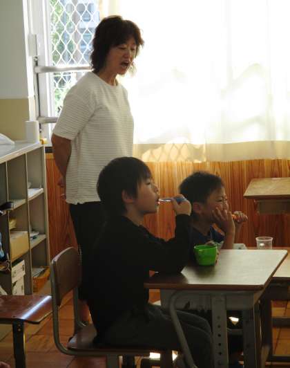 1年生と一緒に歯みがき指導を受けました。上手にみがけるかな?