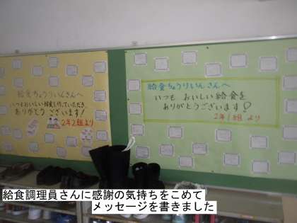 2年生の掲示板には,給食週間の取組が掲示してあります。毎日おいしい給食を作ってくださる給食調理員さんに,感謝の気持ちをこめてメッセージを書きました。