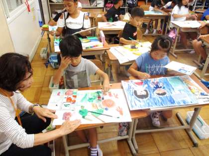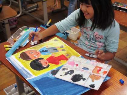 「お話の絵」を仕上げています。絵の具だけでなく,コンテを使うなど工夫しながら描いています。