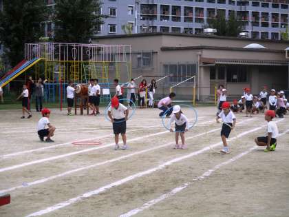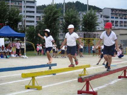低学年の障害物走です。バランスに気を付けてゴールを目指します。