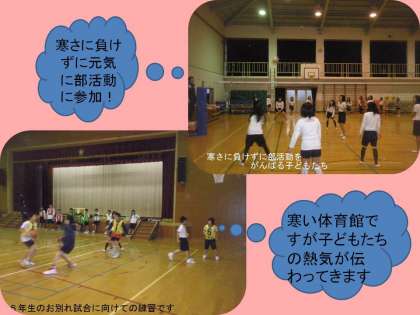 昨日は,運動場での部活動は雪で中止になりましたが,体育館での部活動「バレーボール」「バスケットボール」は予定通り行われました。