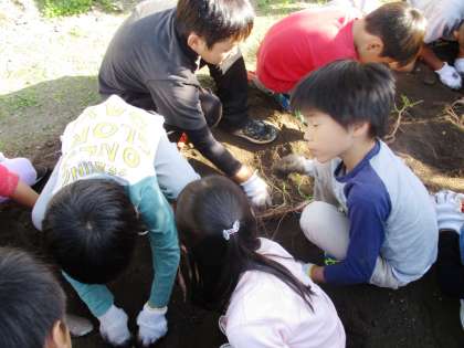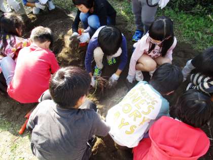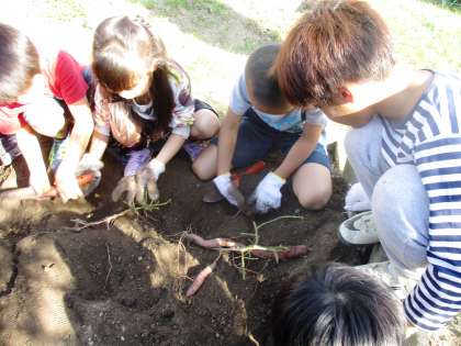 育てたサツマイモの収穫をしました。どこにあるかな?みんなでワクワクしながら畑を掘りました。