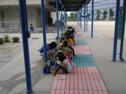 1年生の子どもたちが一人一人育てている「あさがお」が順調に大きく育っています。今日は,みんなで観察会をしてスケッチしました。