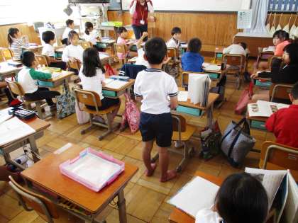 『うみのかくれんぼ』の学習をしています。「たこは,…」に続く文章を教科書から探しています。発表も仕方も発表の聞き方にも成長が感じられます。