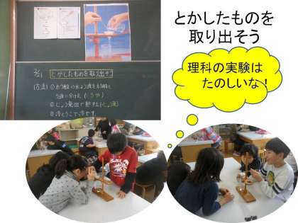 今日は,水の中にとけた「ホウ酸」を取り出す実験をしました。実験は,危険なこともあり,慎重に取り組まなければなりませんが,子どもたちの興味・関心はとても大きいです。理科の苦手な子どもたちも,実験になると楽しく活動しています。
