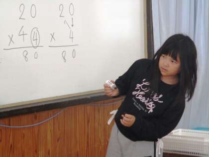 20×4の筆算について学習しています。0が4つと20が4つと考えることで,手順だけでなく,意味の理解もできるようになっています。