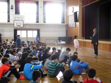 11月の朝会です。校長先生のお話の中で「いじめやなかまはずれにされている人を見たらどうする?」と,友だちを大切にすることをみんなで考えました。全市部活動交流会相撲の部の表彰も集会で行いました。山科川駅伝の決意表明もしました。学校みんなで応援しています。
