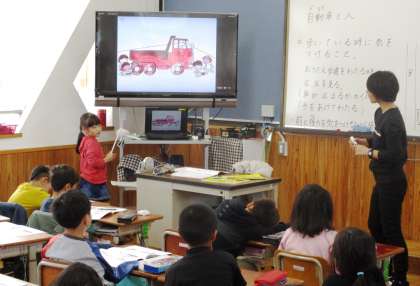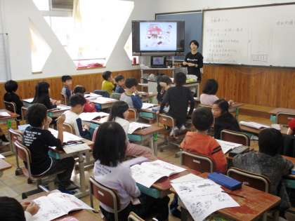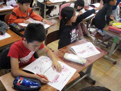 歩いている時に,どんなことに気を付けたらよいか考えました。イラストを見ながら身のまわりにひそむ危険について話し合いました。