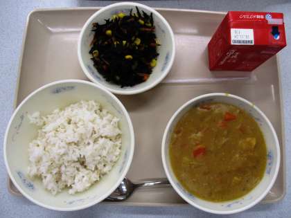 今日の献立は,むぎごはん,チキンカレー,ひじきのソテー,牛乳です。給食のカレーのルーは手作りしています。時間をかけて小麦粉をサラダ油とバターでいためるのが,おいしさの秘密です。