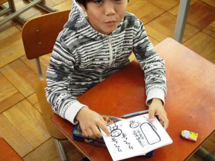 『にがてなたべものとなかよくなろう』というテーマでお話をしてもらいました。『まほうのたべかた』というかわいい絵本も一人一冊作ってくれました。さぁ,仲よくなれるかな?