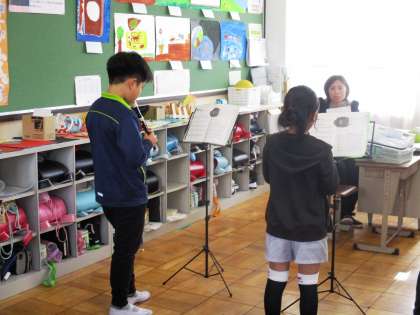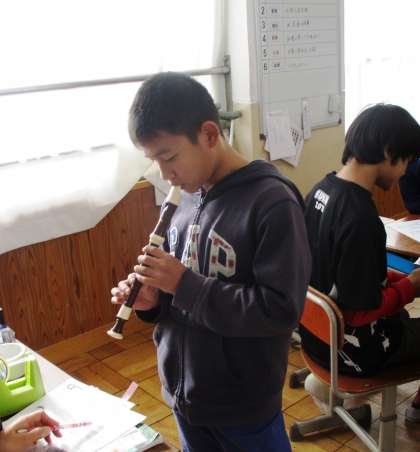 リコーダーのテストをしています。緊張しながらがんばっています。
