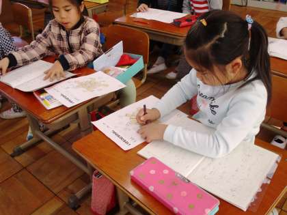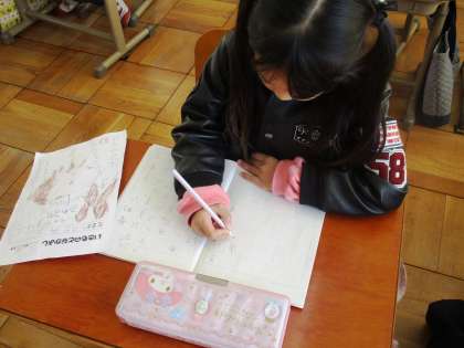 生活科で調べた,うさぎとかめのことを紹介する文章を国語科の学習で書いています。がんばって文章が書けるようになってきましたね。