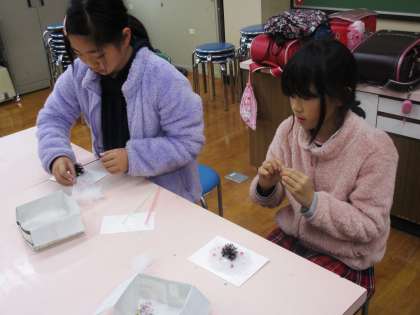 松ぼっくりでクリスマスツリーを作っています。それぞれ工夫を凝らしてステキなツリーができています。